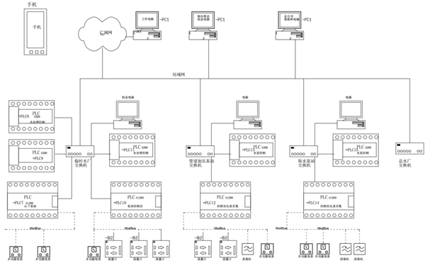 針對河源市勤誠達水務公司進行智慧水務的智能控制系統(tǒng)的設計與實現(xiàn)。智慧水務的基礎是智能供水系統(tǒng),其內(nèi)容上層是組態(tài)軟及數(shù)據(jù)庫,下層是由PLC及各類儀表組成的多種子系統(tǒng),如取水提升泵站子系統(tǒng),制水池控制子系統(tǒng),配電房控制子系統(tǒng)、遠程管路加壓站控制子系統(tǒng)、遠程加藥控制子系統(tǒng)。這些子系統(tǒng)基于多種物理網(wǎng)絡及通訊協(xié)議,組成一個覆蓋范圍廣,能宏觀調(diào)控,有智能算法的智慧水務智能供水系統(tǒng)。